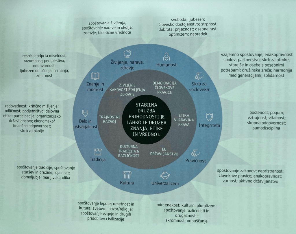 Izpostavil bom dva elementa iz knjige. Prvi je t. i. Evropsko ogrodje etike in vrednot (ali s kratico EOEV). Gre za grafični pregled ključnih ali temeljnih vrednot, ki so družbe (tudi v preteklosti) povezovale in jih delale močnejše, trdnejše, trajnejše in stabilnejše. Predstavlja ga priložena slika.