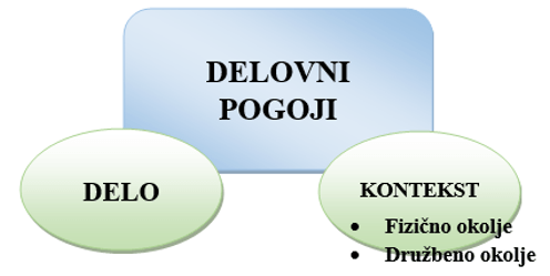 V teoretičnem prostoru je za tovrstno tematiko najbolj uporabljen izraz delovno okolje (ali angl. working environment), plača, odnosi in drugi pa so elementi delovnega okolja. Izraz delovni pogoji pri tem izpostavlja pomembno značilnosti: ti elementi delovnega okolja pogojujejo končni rezultat. Obstajajo torej lahko v različnih stanjih in od tega stanja je odvisno, kakšen bo končni izplen; bodisi v obliki zadovoljstva in motivacije ljudi, bodisi v obliki kakovosti ali količine opravljenega dela, končnega poslovnega rezultata in podobno.