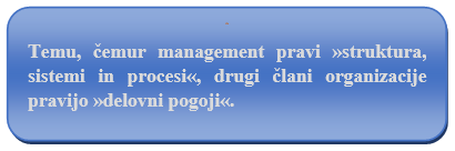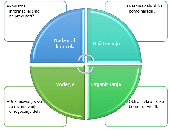 3 Vodenje. Tretja vloga, pogosto v vsakdanjem besednjaku prevzame pomen celotnega managementa, pomeni zagotavljanje delovanja. Želimo doseči, da se uresničuje zastavljeno v prvem in drugem delu. O vodenju je na tem spletnem mestu zapisanega že veliko, zato tu izpostavljam eno prav posebno komponento: samozavedanje. Vodja oblikuje kulturo organizacije. Mora se zavedati sebe, svojega delovanja, lastne komunikacije in zavedati tega, kakšna sporočila posreduje vsem okoli sebe. Kaj naslavlja moja kritika in kaj nagrajuje nagrada, ki sem jo podal? Kaj želim od ljudi, ki delujejo na tem oddelku? Če neka dogovorjena naloga ni bila (povsem) opravljena, v ozadju pa je vseeno bilo vloženo dodatno delo, lahko naša kritika zaduši vso nadaljnje potencialno dodatno vloženo delo. Najprej moramo razumeti situacijo, potem pa jasno sporočiti, kaj je zaželeno in kaj nezaželeno ravnanje, saj ne želimo dajati napačnih sporočil. Vloga vodenja vloga za »polni delovni čas«, ker zahteva veliko vlaganja v zelo mehke elemente osebne rasti, kot je tudi samozavedanje. Vodja je namreč lik, od katerega člani organizacije črpajo sporočila, to pa oblikuje vzorce obnašanja, ki jim bodo sledili člani na oddelku. Tako gradi kulturo, ki je še eden od temeljnih sistemov, ki poganja delovanje in doseganje uspešnosti pri delu.